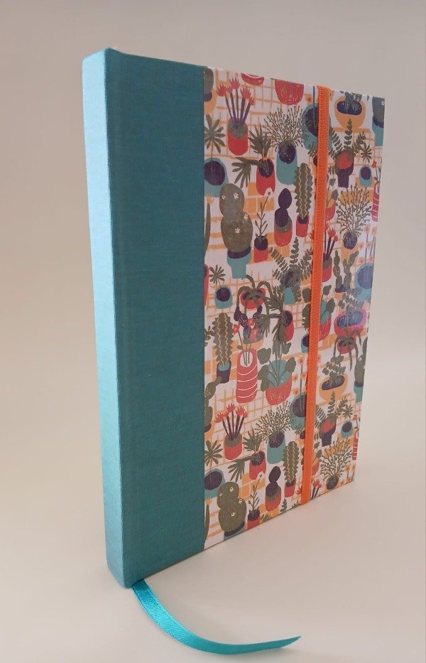 Lomo recto, tapas duras forrada en tela de encuadernar y papel laminado. Elástico y sobre.